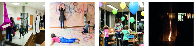 Schon früh am Abend füllten sich die Räume mit neugierigen Besuchern jeden Alters. Ganze Schulklassen trafen ein, um exklusiv für sie gebuchte Workshops um 17 Uhr zu besuchen und anschließend dem regulären Programm beizuwohnen. Drei Schulklassen aus Solothurn hatten sich besonders für die Art Science Night engagiert: Die Kinder und Lehrerinnen arbeiteten bereits im Vorfeld des Events intensiv zur Thematik „gezeichnete Bewegung – bewegte Zeichnung“ und präsentierten am Abend ihre daraus entstandenen Daumenkinos sowie Zootropenbilder und teilten ihr erworbenes Know-How mit den beeindruckten Gästen. Ein Stockwerk höher luden die Kinder von KidsWest Bern die Besucher zum gegenseitigen Portraitieren ein, was zu schönen Begegnungen führte. Im Farblabor wurde intensiv zum Phänomen Farbe geforscht, im Idealfall konnte das erworbene Wissen gleich nebenan bei der Bemalung der selber gebauten Kreisel eingesetzt werden.